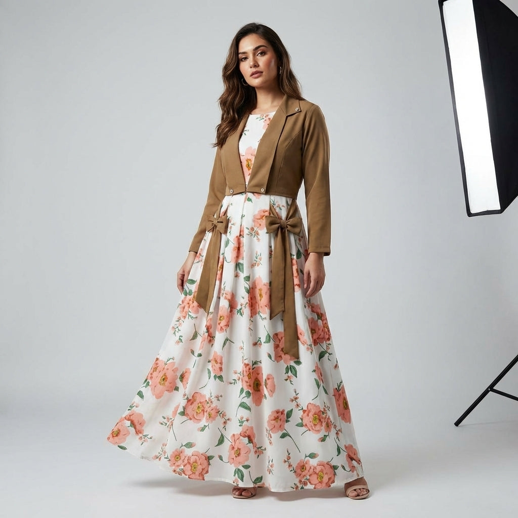 Digital Printed Long Flare SleeveLess Belt Attached Maxi With Cotton Koti 2Pcs